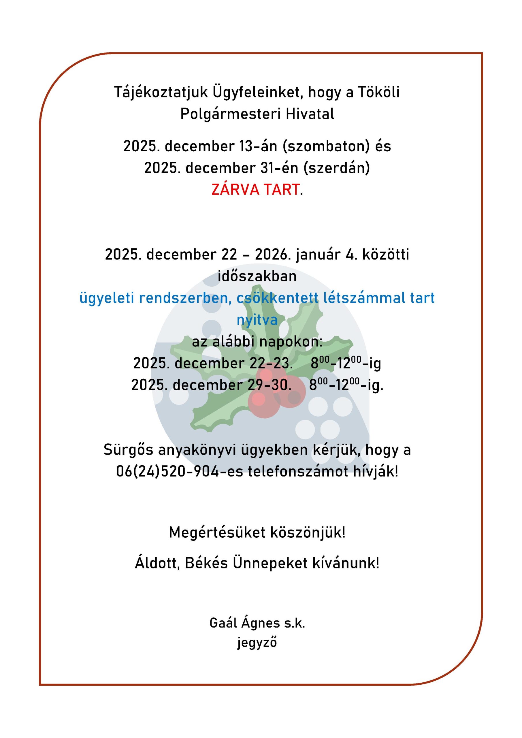 Ezúton értesítjük Önöket, hogy az MBH Bank Nyrt. tököli bankfiókjának nyitvatartási rendje 2025. január 5-től az alábbiak szerint módosul: