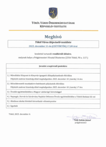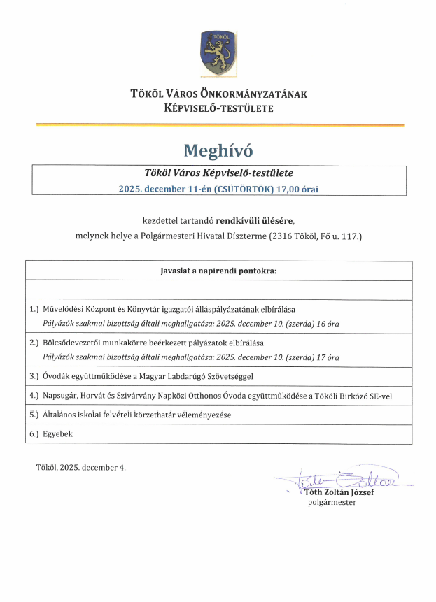 Meghívó Tököl Város Képviselő-testületének december 11-én tartandó rendkívüli ülésére