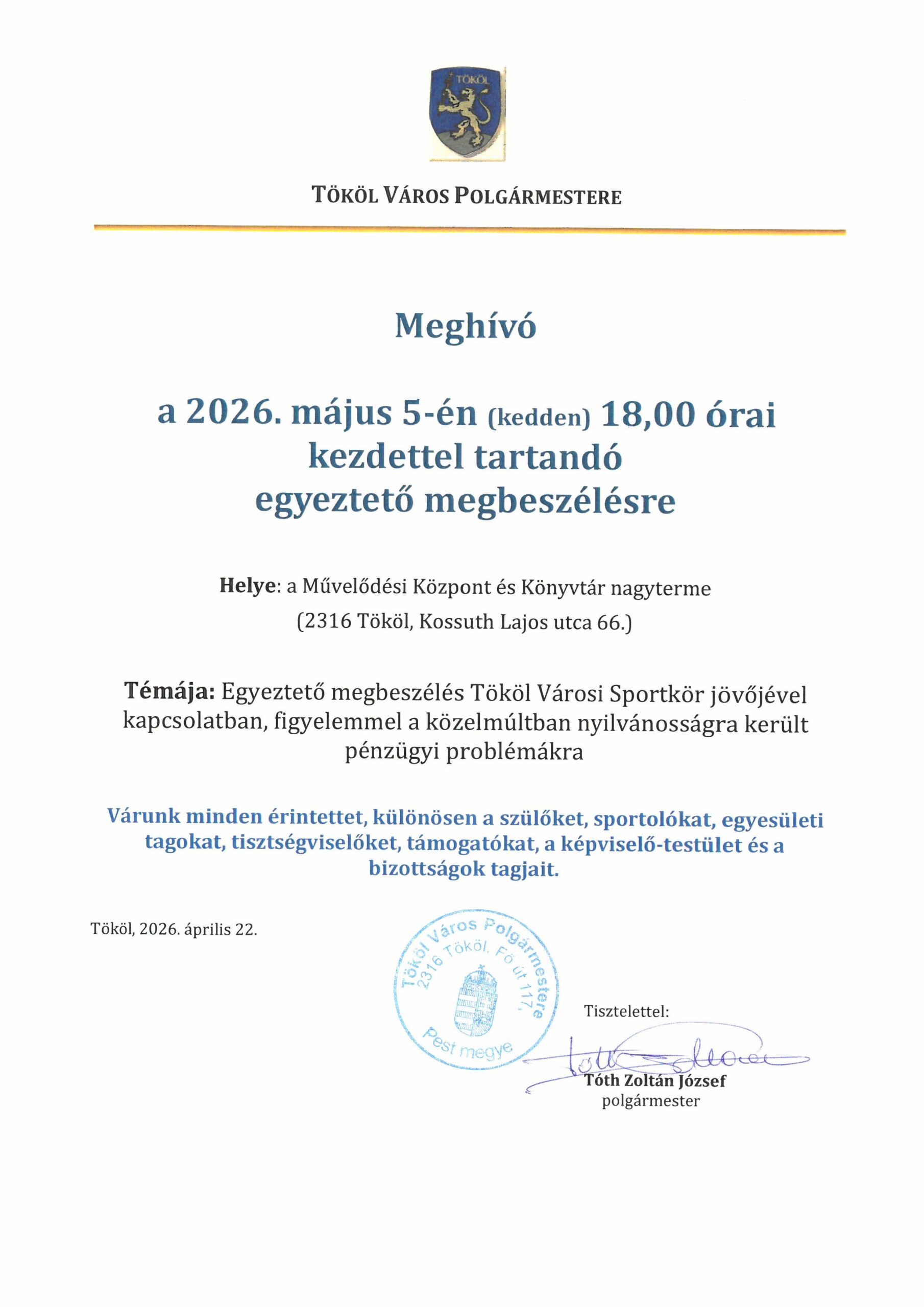 Tököl Város Képviselő-testülete a helyi sportegyesületek 2026. évi támogatására az 1. számú, az önszerveződő közösségek 2026. évi támogatására a 2. számú pályázatot teszi közzé.